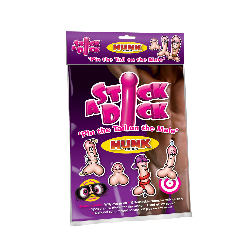 Pin the Tail on the Male 12 cute willies from which to pick, close your eyes then Stick a Dick Stick a Dick is the grown up version of the old party favourite Pin The Tail On The Donkey. Unfold the almost life size naked man, choose your weapon from the 12 reusable sticky dicks, don your mask, then spin around three times and place your sticker where you think it should go. The results are hilarious. And if youre closest to the target, youll be cock a hoop, with a clever dick sticker to prove it. If you take it out on the town, why not cut out the face using the dotted line and find a willing male brave enough to model the sheet. Wherever you stick it, Stick a Dick is the perfect party game for naughty nights in, or outrageous nights out. Game Includes Willy eye mask 12 Reuseable character willy stickers Special prize sticker for the winner Giant glossy poster Optional cut out head so you can play on any male